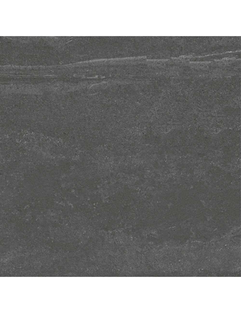 Carreau de grès cérame aspect pierre en gris graphite. Il s'agit d'un grès cérame teinté dans la masse, très résistant aux rayures et à l'abrasion. La surface est lisse au toucher et présente de délicates veines gris clair qui confèrent au sol élégance et mouvement. Disponible en trois formats, tous trois rectifiés.